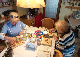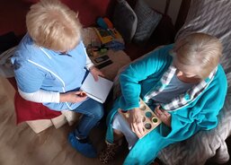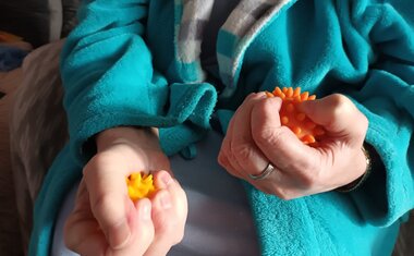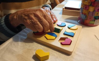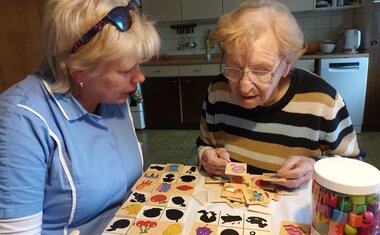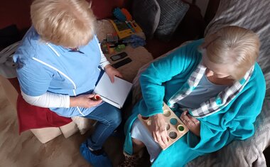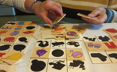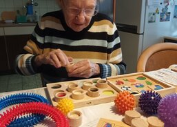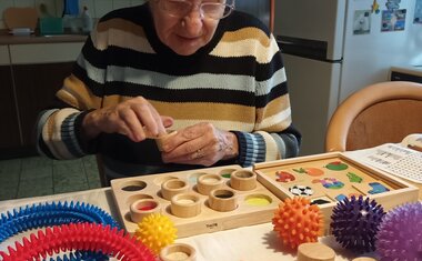 Osobní asistentka si připravila pomůcky a vyrazila za klienty autem, které bylo zakoupeno právě pro potřeby osobní asistenční služby také díky podpoře dárců Tříkrálové sbírky 2024. Klientka mi po příjezdu a návrhu činnosti sdělila, že ji „hraní“ vždy moc bavilo a vyprávěla o svých oblíbených hračkách z dětství a o tom, s čím si ráda hraje se svými pravnoučaty. Poté si sama vybrala pomůcky, které ji nejvíce zaujaly a které chce, aby jí paní asistentka přivezla i příště. Klientku nejvíce zaujaly cvičící kroužky a balónky, smyslové válečky na poznávání různého materiálu, skládání geometrických tvarů a stínohra, kde se ke stínům přiřazují správné obrázky.