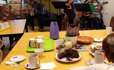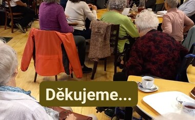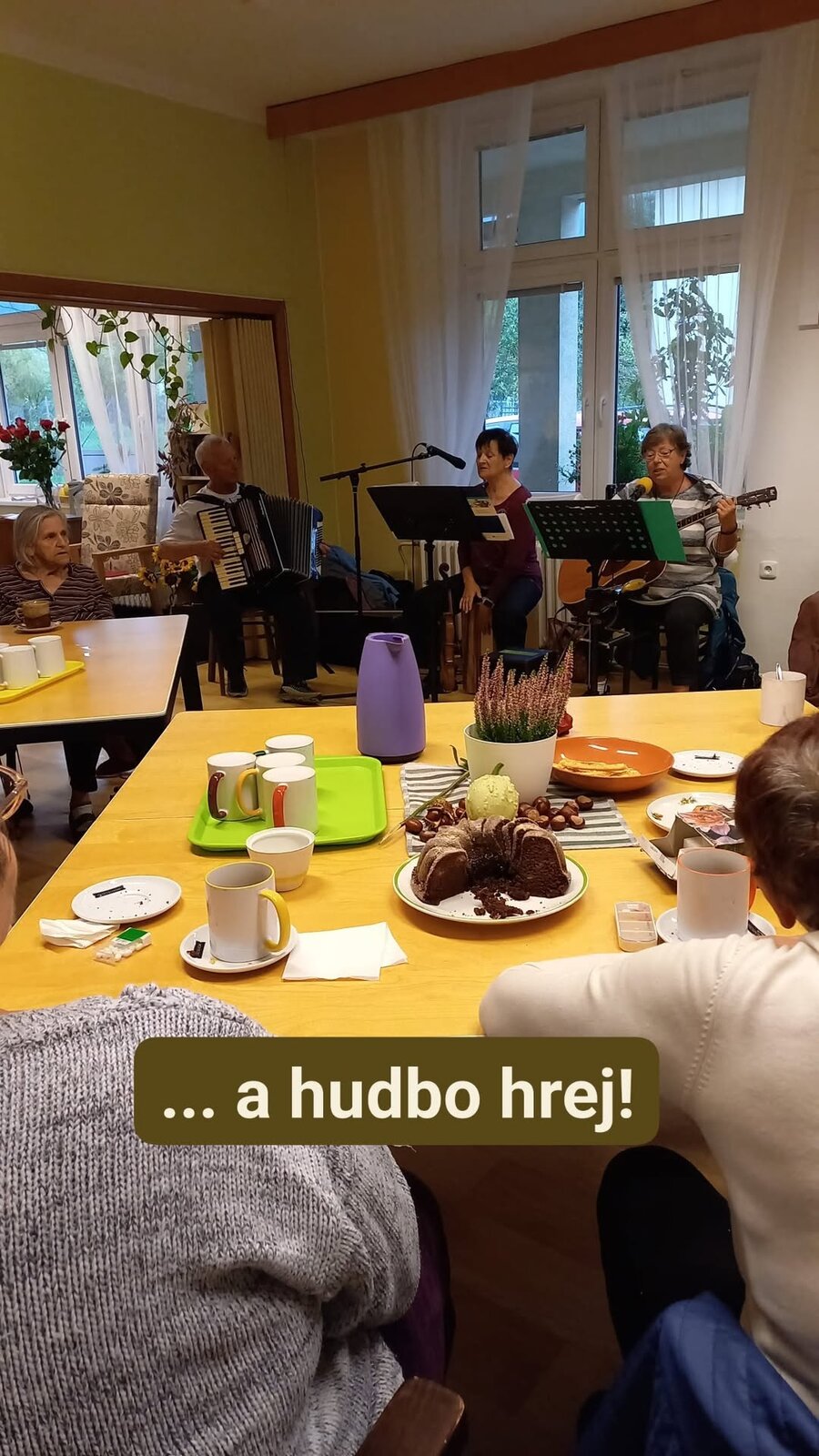 Odpoledne jsme se těšili na hudební program. Dveře se u nás tentokrát doslova netrhly – hosté přicházeli, židlí ubývalo, ale všichni jsme se nakonec pohodlně vešli – „dobrých lidí se vždy vejde… .“ O příjemnou atmosféru se postarala hudební skupina Našli se, s níž jsme si při kávě a čaji zazpívali známé české písničky.