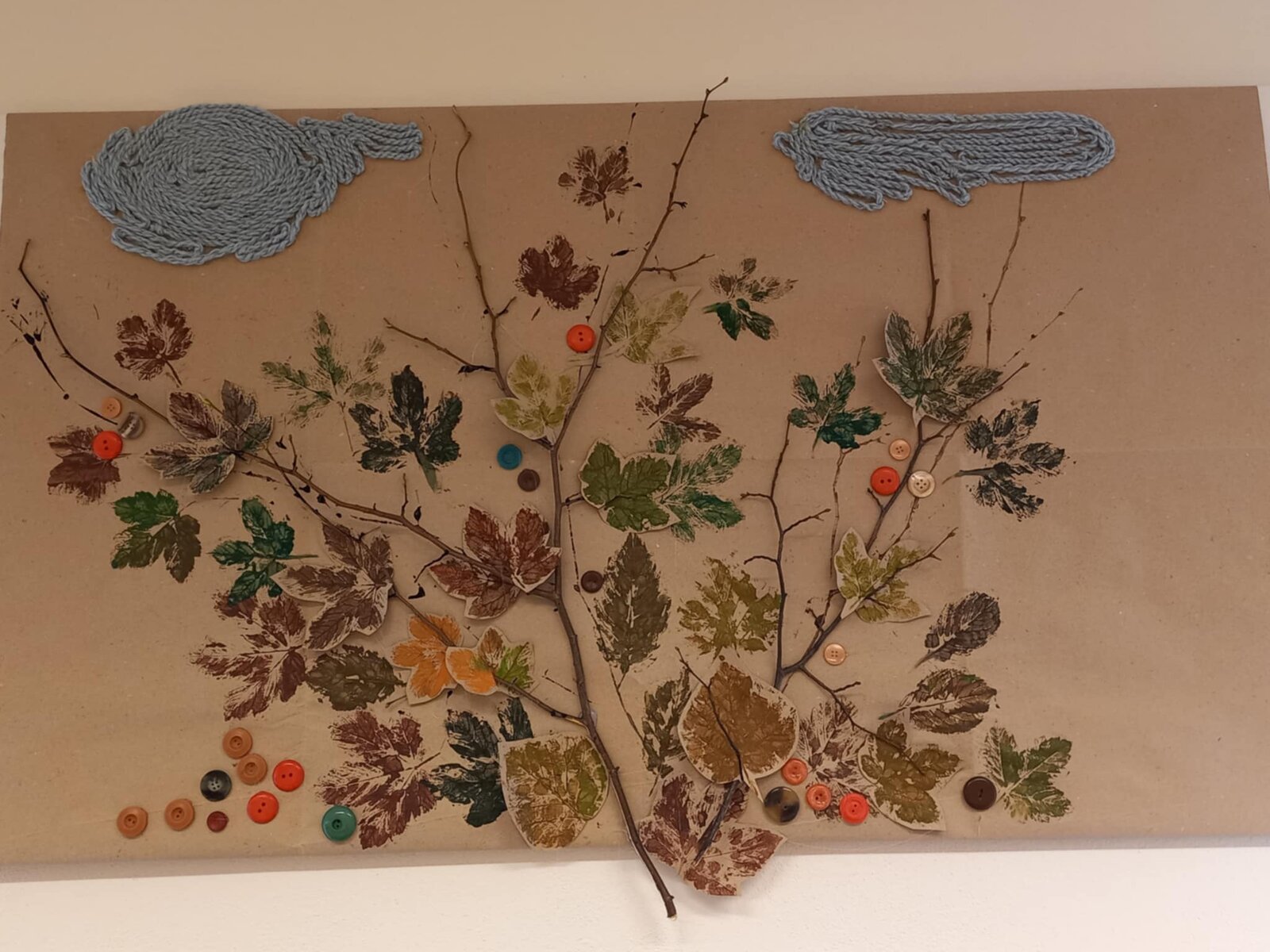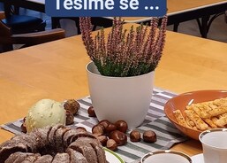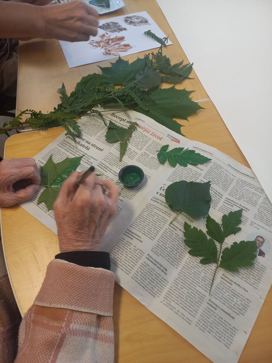 Po oslavách jsme se pustili do podzimní výzdoby. Na stoly jsme vyrobili ubrus s otisky listí, jarní obraz plný květin nahradil podzimní motiv listů a oblohy, a dveře do stacionáře nyní zdobí velký papírový věnec, který klienti pečlivě vykreslovali lístek po lístku.